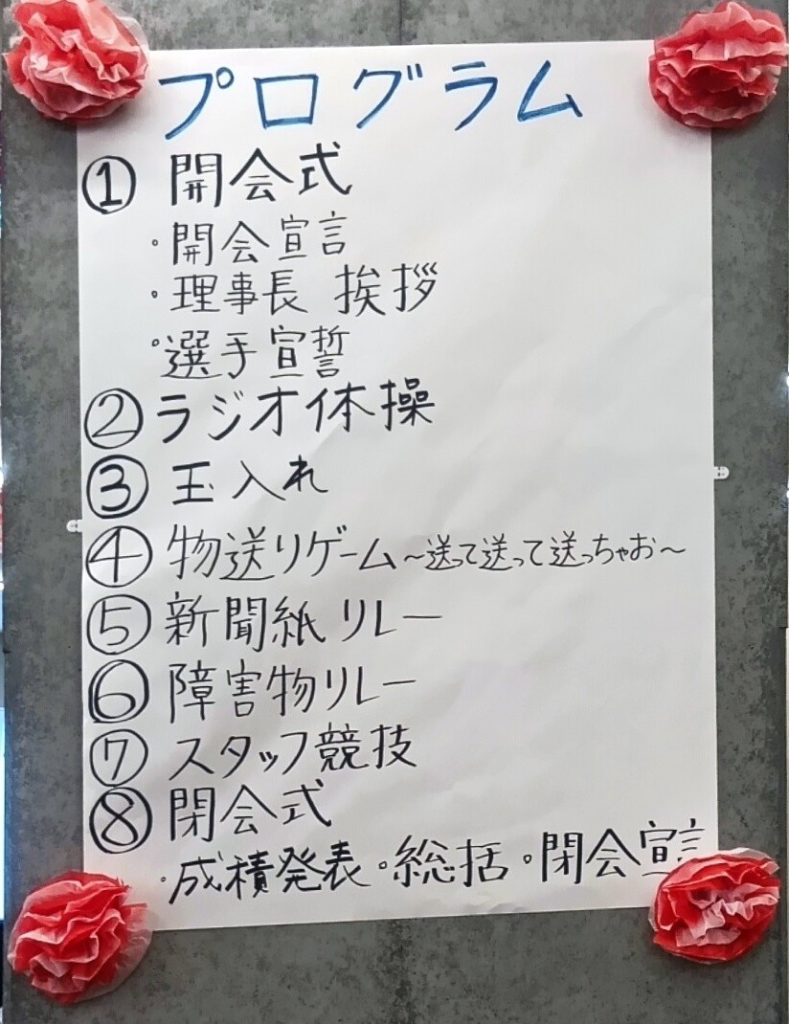 当日は、理事長の挨拶から始まり、玉入れや大玉送り、新聞紙リレー、障害物リレー等、